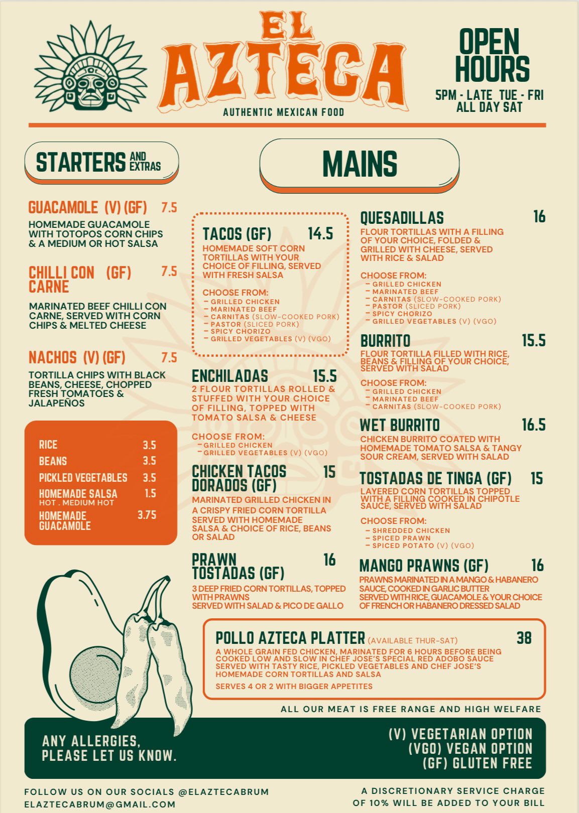 We now have another food option courtesy of our friends at El Azteca who came in for a pop-up and decided to stay! You can find them on the top floor. To book please whats app 07871 058683 or email elaztecabrum@gmail.com